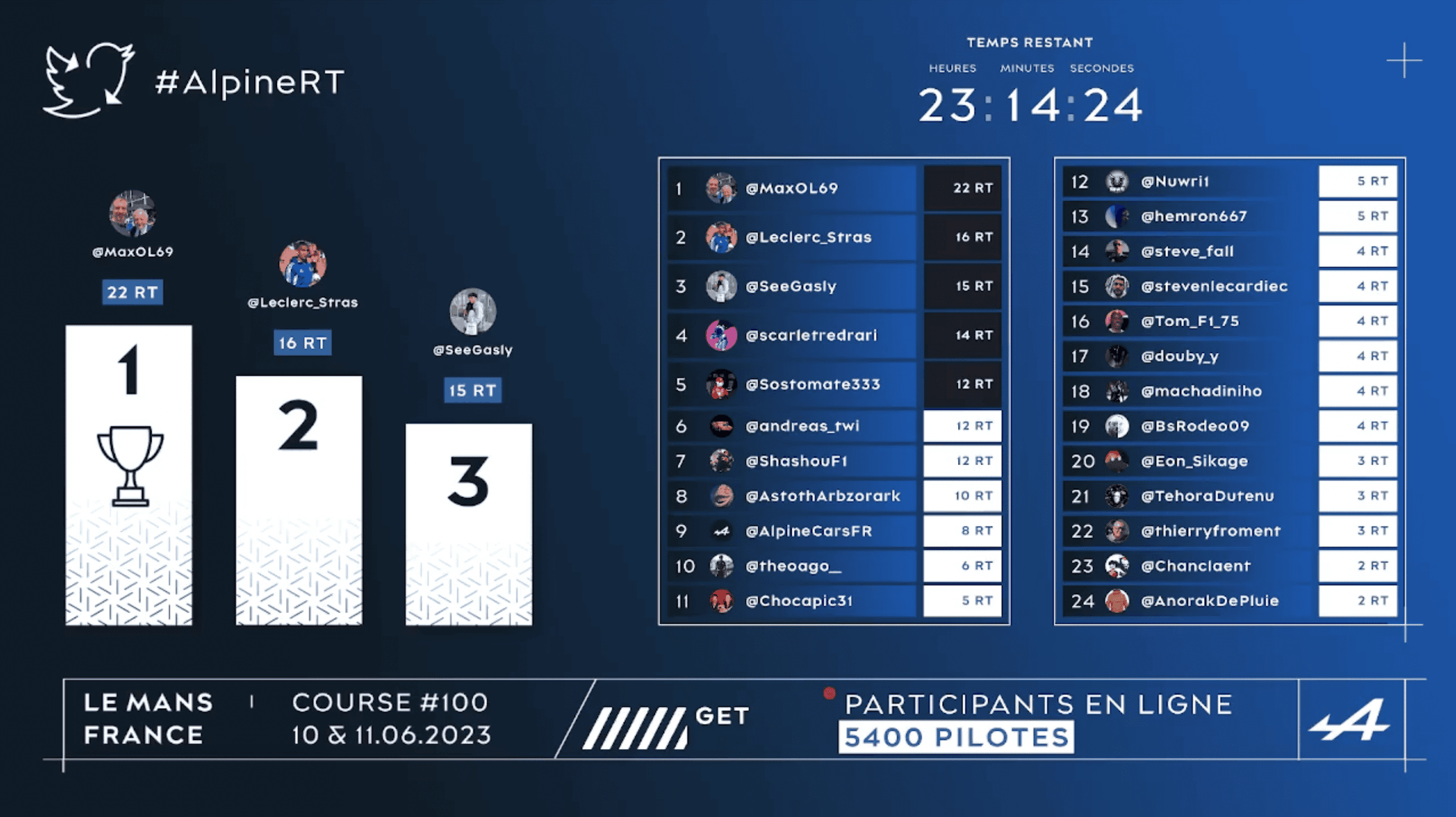 Le but était d'avoir le plus de retweets sur son tweet qui contenait le hashtag #AlpineRT. Le live affichait le podium les participants ayant le plus de retweets, en temps réel en fonction de l'évolution des retweets.